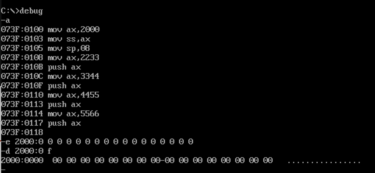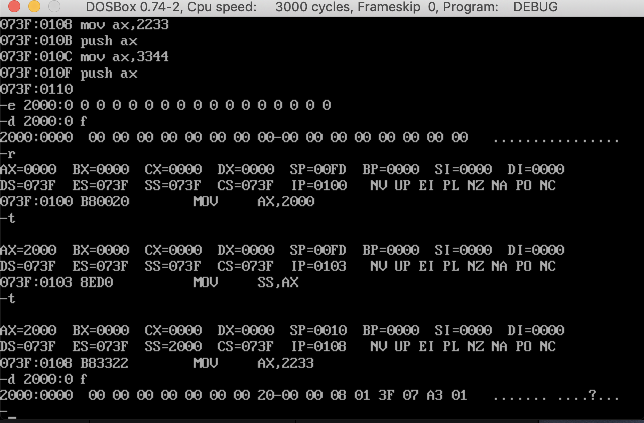 可以看到的现象是:开始的时候栈中是没有数据的,栈桢SP指向2000:0010的位置。