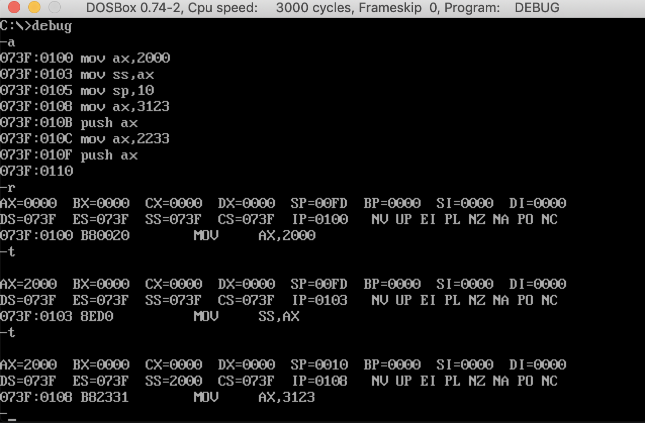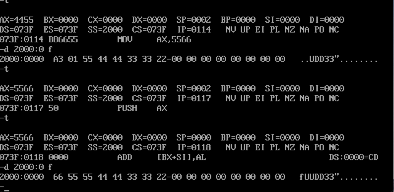 使用a将下面的汇编指令写入内存,然后使用T命令调试。如下: