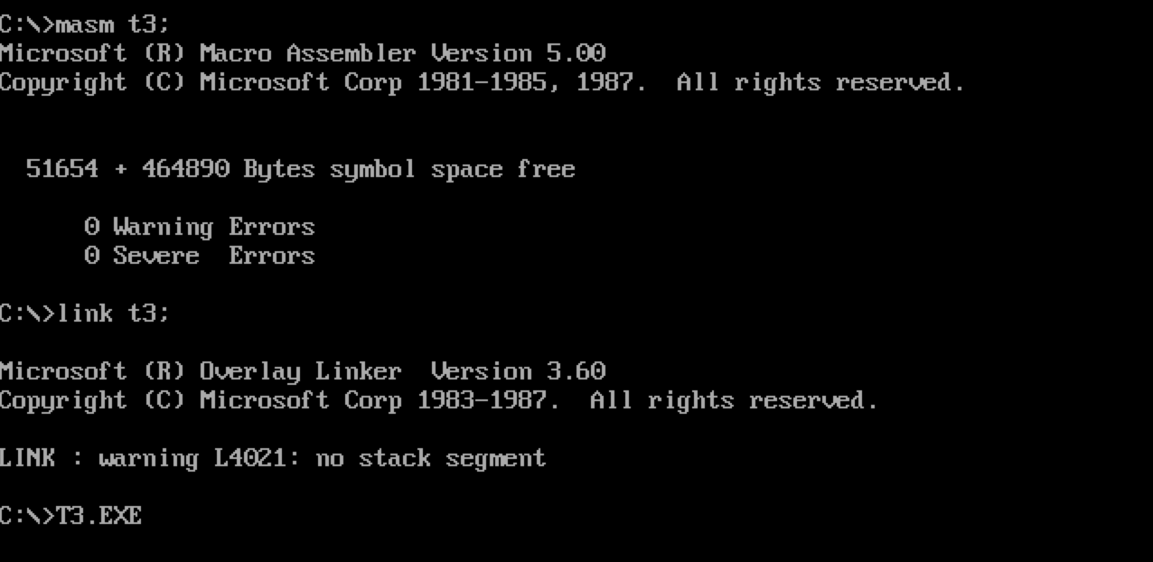 每一段汇编指令都需要以mov ax,4c00H,int 21H结尾。在调试到int 21H的时候需要使用P命令执行。出现Program terminated normally程序正常退出。