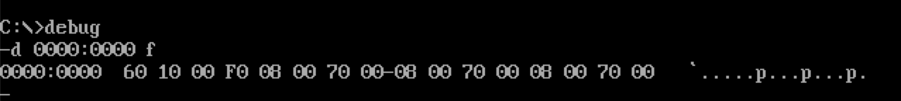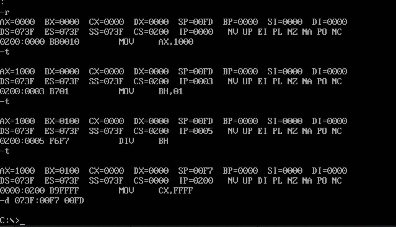 经过实验发现DOSBox的和传统的DOS还是有一些区别的,这里用一个小实验验证中断:首先我们直接在debug下面将0号中断向量号改写成为0000:0200处,然后在另一块内存0200:0000中写进了会引发0号中断的代码: