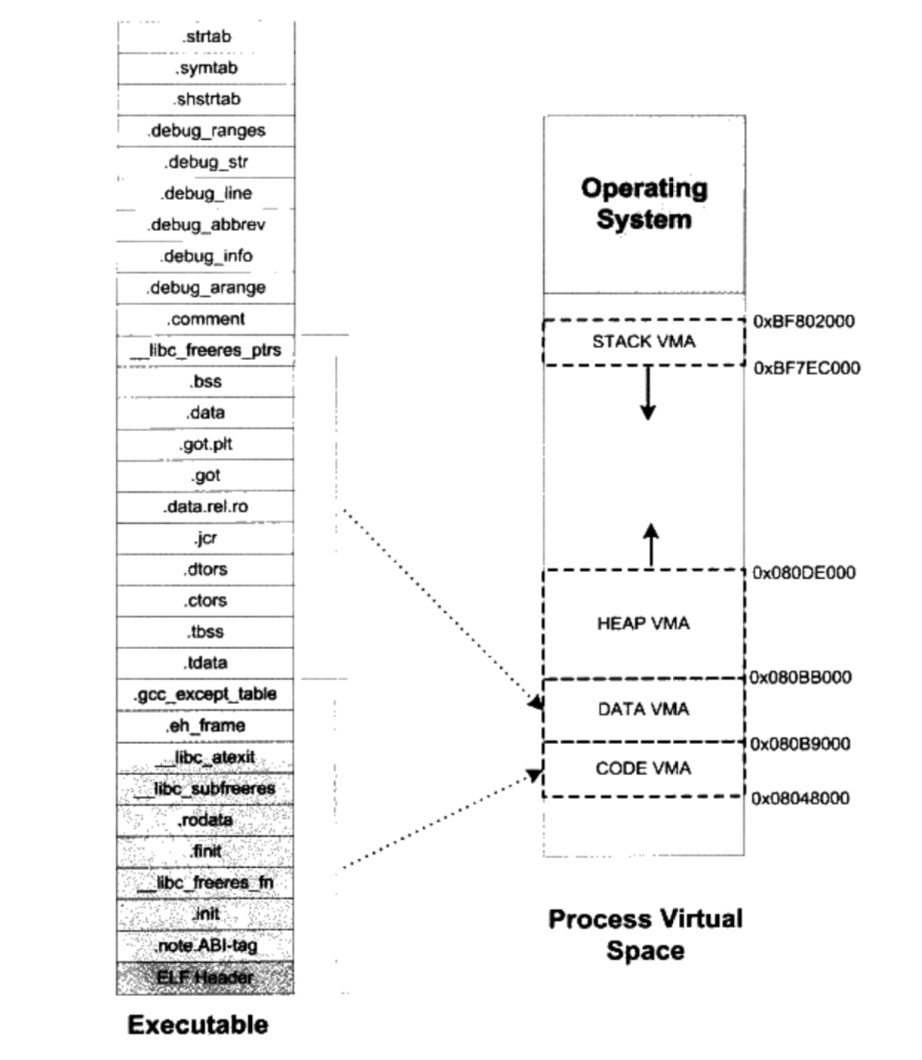 很明显,这种映射关系是保存在操作系统中的一个数据结构(类似页目录)。Linux中将进程虚拟空间中的一个段叫做虚拟内存区域(VMA,Virtual Memory Area)。操作系统在内部保存这种VMA结构,就是因为当程序发生段错误的时候,可以通过查找这样一个数据结构来定位错误页在可执行文件中的位置。